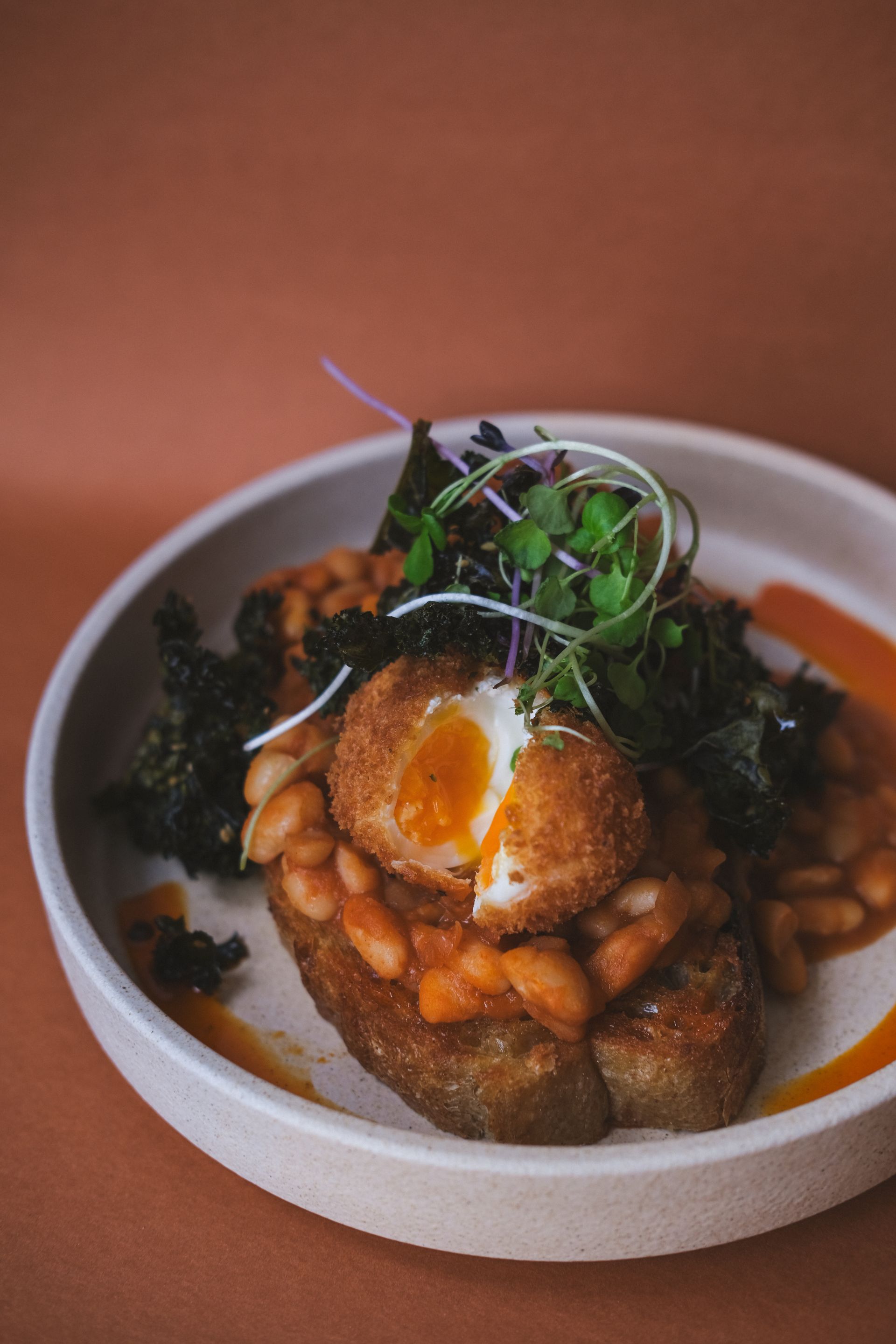 House made baked beans, crumbed poached eggs, kale chips, on sourdough
