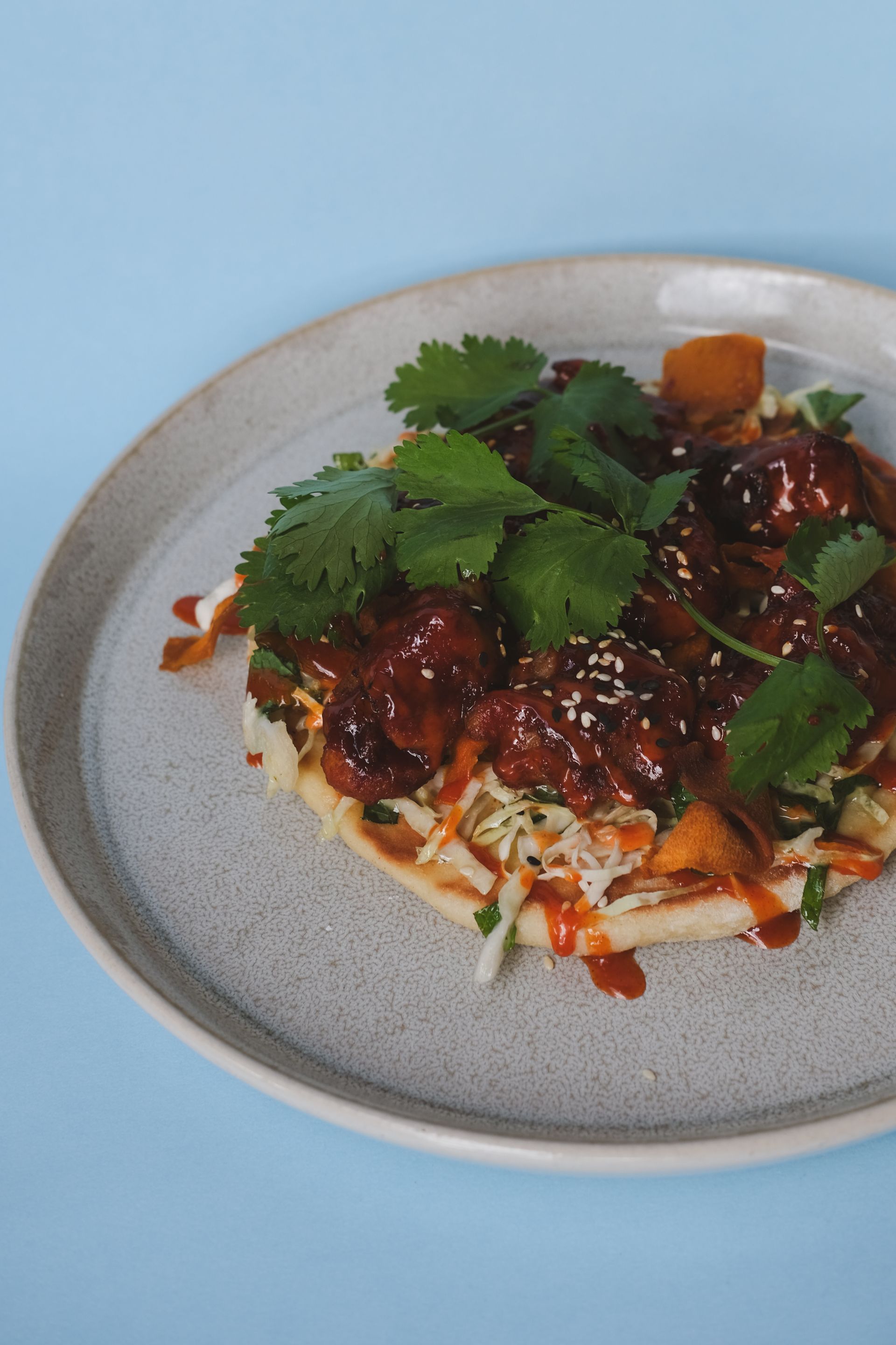 House made flatbread, gochujang chicken, cabbage slaw, coriander and lime dressing, sweet potato crisps
